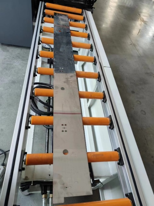 After starting up, program presets are made according to the hole position combination requirements. After presets are completed, the door frame/door panel is loaded. After fixation, foot stamping is performed to achieve one-time molding of all hole positions/cutting angles.