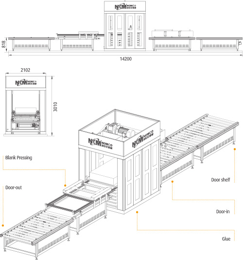 The gluing machine composed of several hot pressing plates for pressing and heating each group of pressing plates. It is the most widely used door gluing engine. Its full name is itelligent flow hot - press gluing machine. It is to put the door slab into the filer with the plate loading machine into the multi-layer hot press, heating and pressure at the same time, the slab pressing the finished door fan, according to the mode of operation is divided into two types of periodic and continuous, the commonly used in China is the periodic muli-layer hot press. The hot press is composed of three parts: the hot press body, the control drive part and the heating system. Itelligent single-piece flow hot pressing gluing machine, including feeding roller conveying, guide conveying door device, hot pressing gluing main engine, positioning conveying edge holding device and out conveying device.