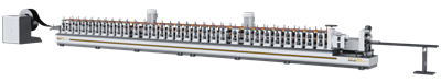 卷料送料后,通过冷弯成型的方式,实现门框框型的成型,成型完毕后,再通过液压冲剪的方式,实现断面成型及长度输出,同时整线采用PLC控制系统,可按需定制门框长度,按需选取冲剪断面,一台设备即可实现整扇门框上框/锁框/铰链框的生产(诺下档框材质框型一致亦可同步完成)。
